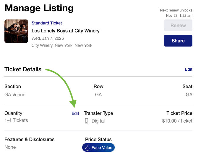 You can now mark your ticket listings as "splittable", allowing buyers to choose how many tickets they want to purchase from you. This makes selling faster and more flexible!